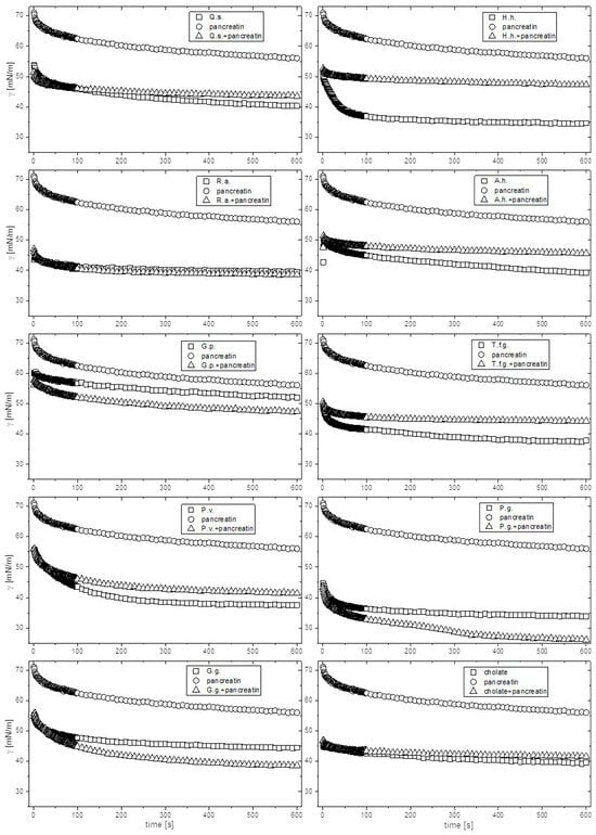 Dynamic surface tension for sodium cholate and the extract aqueous solutions and their mixtures with pancreatin (1% each). The curve for pancreatin alone is also shown for comparison. Q.s.—Quillaja saponaria cortex, R.a.—Ruscus aculeatus rhizoma, G.p.—Gypsophila paniculata radix, P.v.—Primula veris radix, G.g.—Glycyrrhiza glabra radix, H.h.—Hedera helix.