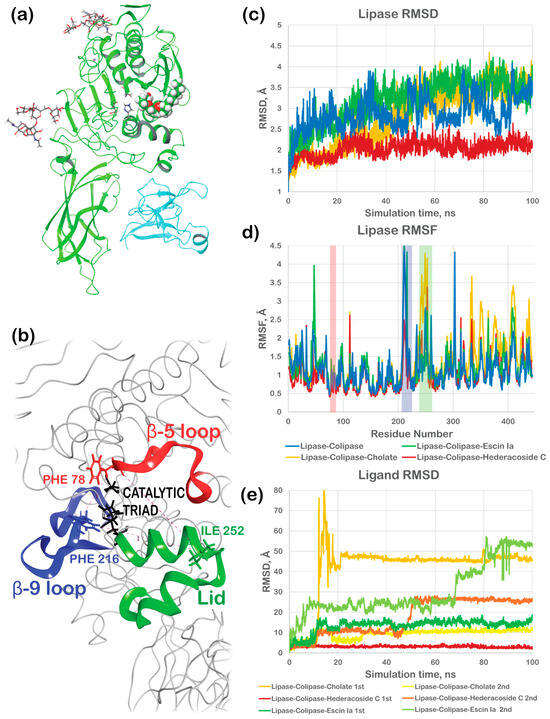 The results of 100 ns molecular dynamics simulation for five systems under investigation: (a)—reference lipase–colipase–TGME complex (PDB ID: 1ETH); (b)—zoom-in catalytic triad core and gateway loops β-5, β-9, and the lid (residues PHE 78, PHE 216 and ILE 252 are located at the tip of the loops and are used for distance measurements); (c)—root mean square deviations (RMSDs) of lipase throughout the simulation time; (d)—root mean square fluctuations (RMSFs) of lipase throughout the simulation time; (e)—root mean square deviations (RMSDs) of a ligand fit on lipase throughout the simulation time.
