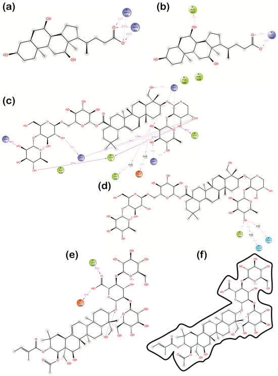 Two-dimensional interaction diagrams for the last 50 ns of the 100 ns MD simulation of LC-Cholate model: (a)—1st ligand and (b)—2nd ligand; LC–Hederacoside C model: (c)—2nd ligand and (d)—1st ligand; and LC–Escin Ia model: (e)—1st ligand and (f)—2nd ligand.