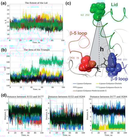 The analysis of the lipase’s active site measurements as a function of time for Lipase, Lipase–Colipase, LC–Cholate, LC–Hederacoside C, and LC–Escin Ia models: (a) the extent of the lid represented as a height (h) of the triangle between the tips of the gateway loops β-5, β-9, and the lid (measurement was made between Cα of PHE 78, PHE 216, and ILE 252, respectively) pointed from ILE 252; (b) the surface area of the triangle between the tips of the gateway loops β-5, β-9, and the lid; (c) illustration of the triangle used for measurement; (d) distances between active site residues.