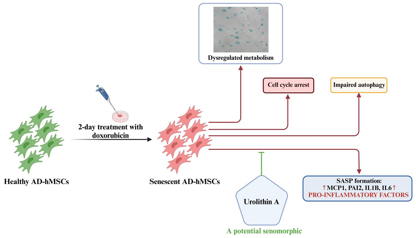 This study focuses on the effects of urolithin A in a post-treatment model of doxorubicin-induced senescence in AD-hMSCs, highlighting its potential as a senotherapeutic agent. Unlike most previous studies, which primarily investigate pre-treatment models where urolithin A is administered prior to exposure to a senescence inducer [8,9], our work explores whether urolithin A can affect cells in which senescence is already established.