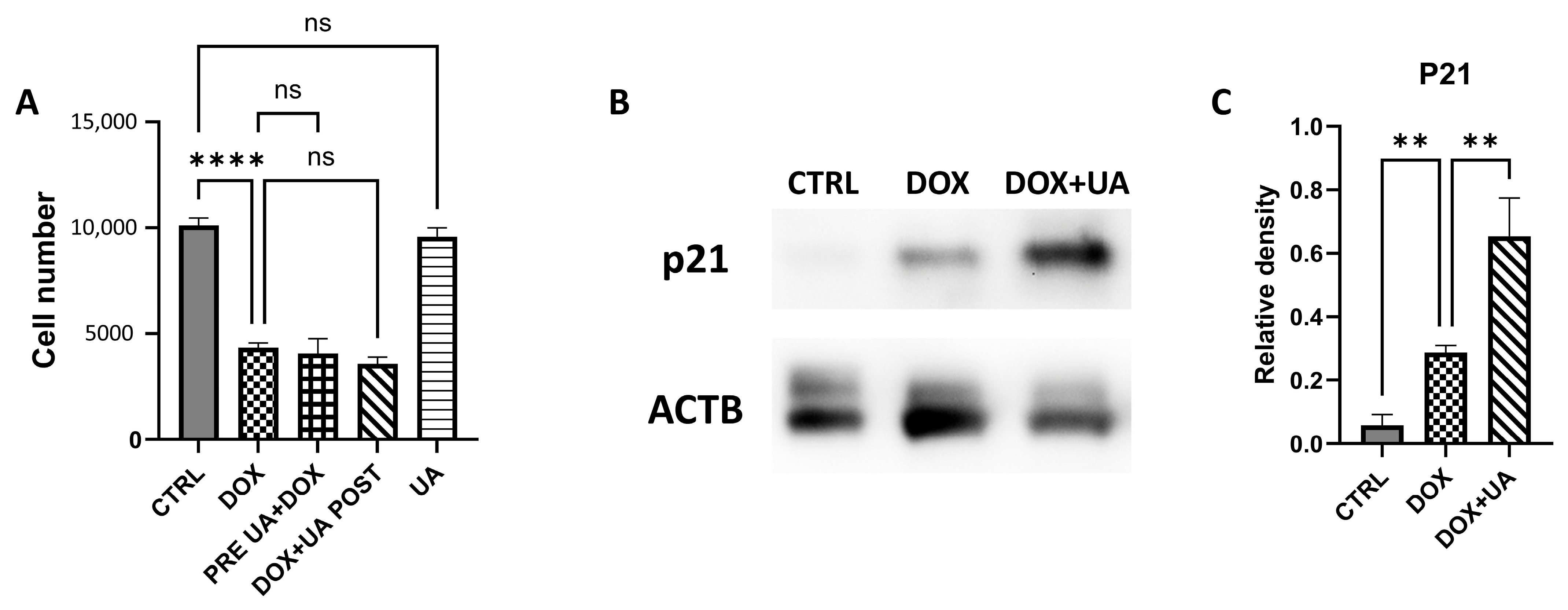 Figure 1. Urolithin A does not affect proliferation of healthy and senescent AD-hMSC. (A) Cell proliferation rate determined with CCK-8 assay. Data are expressed as a final cell number, where initial cell number per well was 4000. Doxorubicin («DOX»), Urolithin A («UA»); pre-treatment (PRE UA + DOX) group; post-treatment (DOX + UA POST) group. (B) Representative Western blot images showing cyclin-dependent kinase inhibitor 1A (p21; 21 kDa) and an internal control beta-Actin (ACTB; 45 kDa). (C) Graphical visualization of Western blot analysis of p21 protein (n = 3; «CTRL»—control group of intact AD-hMSCs; ** p ≤ 0.01; **** p ≤ 0.0001; «ns»—not significant).