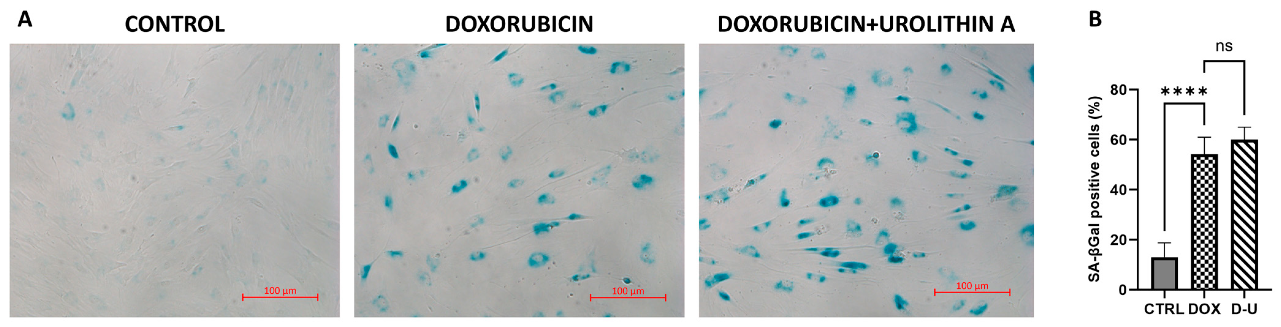 X-gal staining of AD-hMSCs revealed minimal SA-βGal activity in healthy cells, whereas doxorubicin treatment markedly increased β-galactosidase activity. Treatment of senescent AD-hMSCs with urolithin A did not attenuate the doxorubicin-induced elevation in SA-βGal activity (Figure 2). These data indicate that urolithin A does not mitigate the doxorubicin-associated increase in lysosomal β-galactosidase activity under these conditions.
