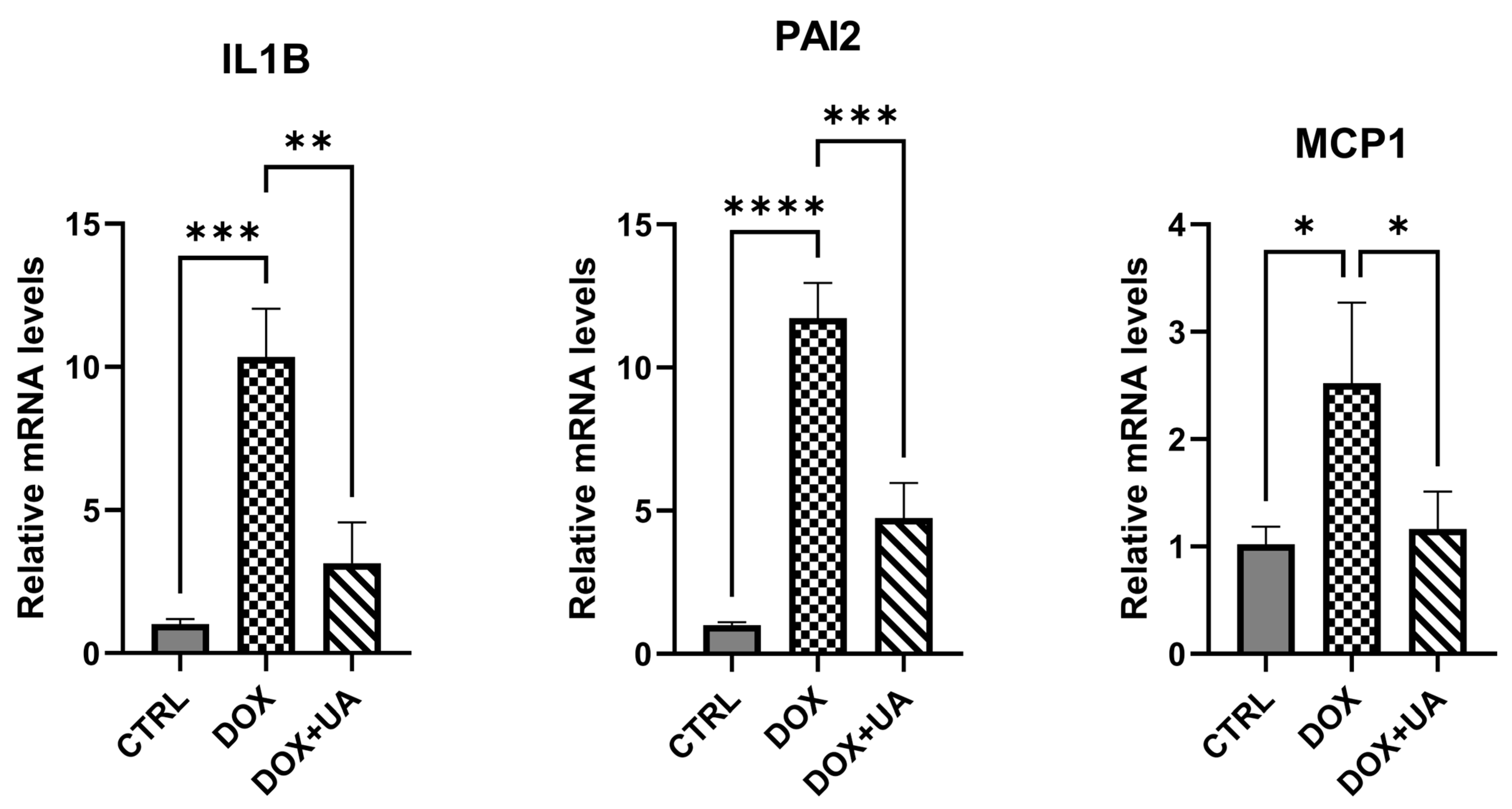 To investigate whether urolithin A exhibits senomorphic activity, we performed RT-PCR and multiplex cytokine assay to evaluate its impact on key pro-senescent factors. First of all, we performed a brief RT-PCR analysis and demonstrated that urolithin A effectively reduced doxorubicin-mediated increases in pro-inflammatory factors IL1B, MCP1, and PAI2 (Figure 3).