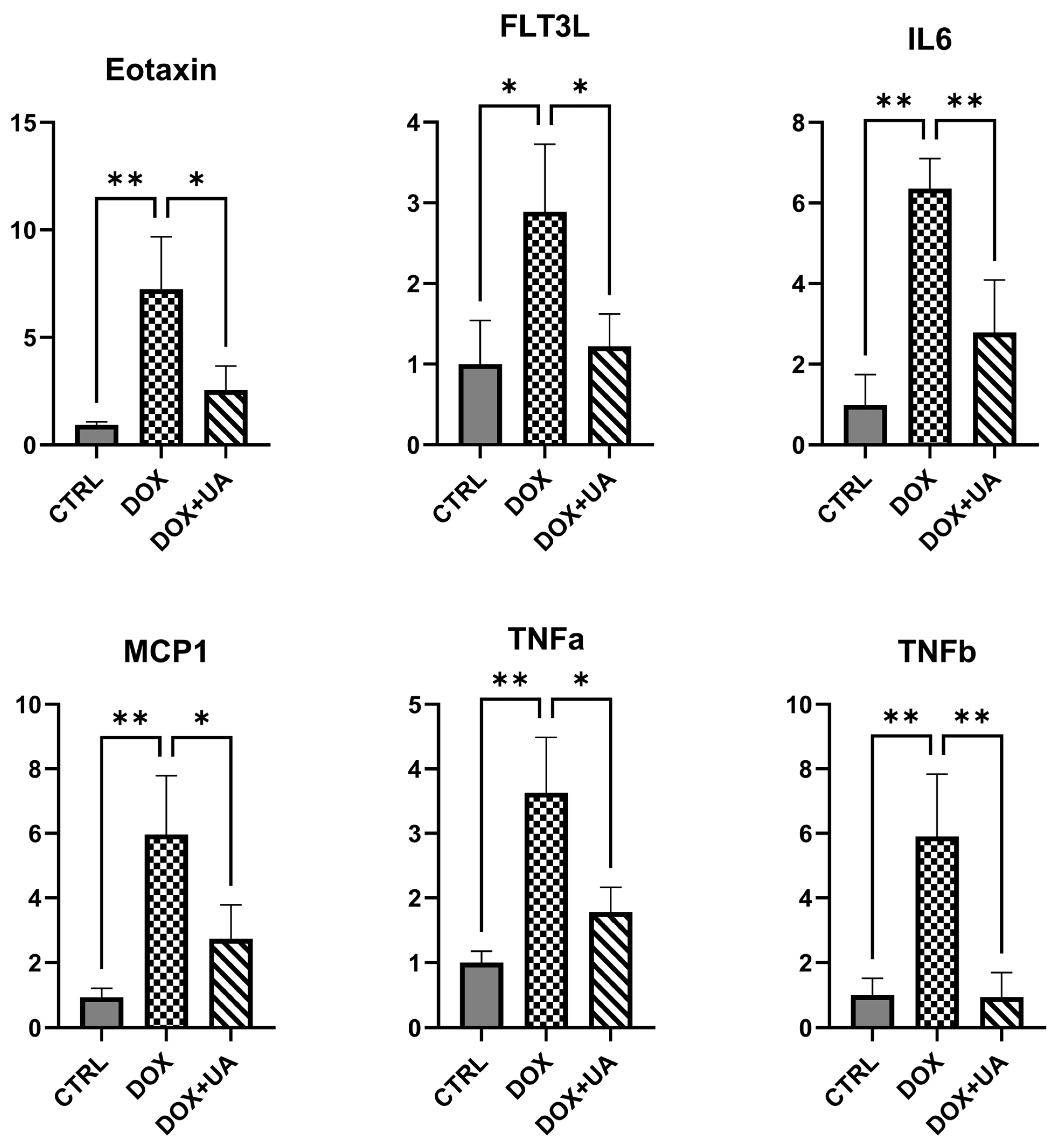 To further evaluate the potential senomorphic activity of urolithin A, we profiled conditioned media collected from AD-hMSCs using a multiplex cytokine assay. Urolithin A attenuated the doxorubicin-induced increases in eotaxin, FMS-like tyrosine kinase 3 ligand (FLT3L), interleukin-6 (IL6), tumor necrosis factor-α (TNF-α), tumor necrosis factor-β (TNF-β; lymphotoxin-α/LTA), and MCP-1 (Figure 4). IL6, TNF-α, TNF-β, and MCP1 are well-established SASP components and are included in the SenMayo gene set [14].