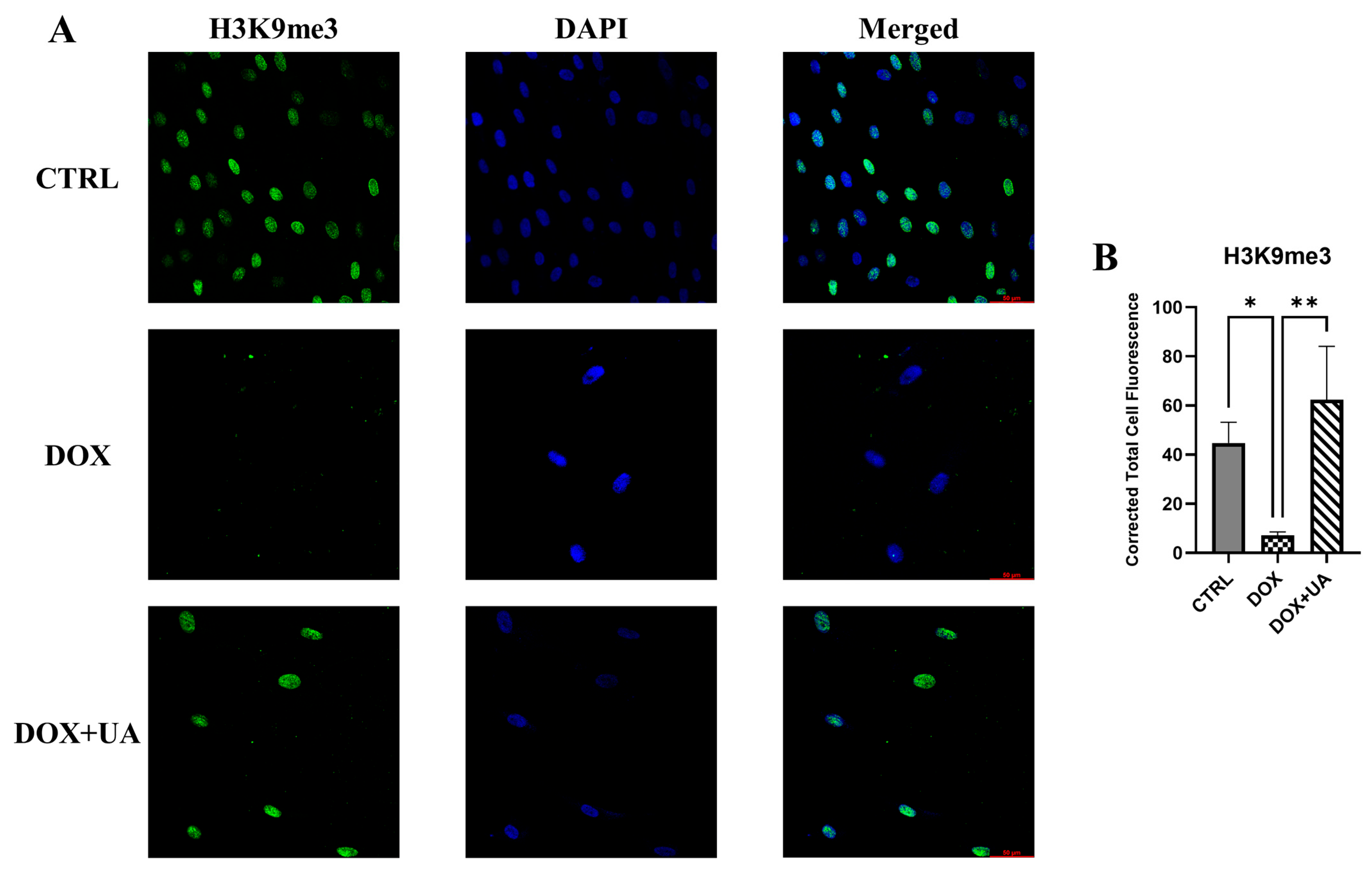 Figure 5. Fluorescent confocal microscopy images of H3K9me3 and DAPI. (A) Representative images of dramatic changes in H3K9me3 levels (DAPI staining was made to show nuclear localization of H3K9me3). (B) Quantitative analysis of H3K9me3 fluorescence intensity (n = 3; ** p ≤ 0.01; * p ≤ 0.05).