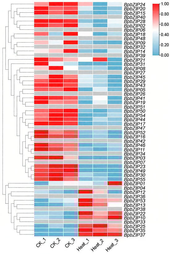 Expression patterns of BpbZIP genes under heat stress. Each sample was repeated three times. Gene expression data were log2-transformed and normalized to the zero-to-one scale.