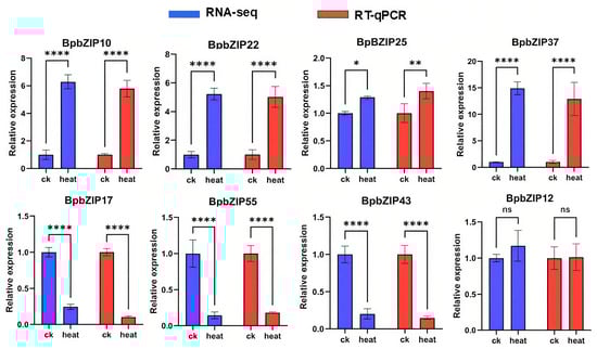 RNA-seq analysis was conducted on the leaves of B. purpurascens under heat stress and control conditions to investigate the effects of heat treatment on BpbZIP gene expression. To visualize the changes in gene expression levels following heat treatment, a heatmap was generated (Figure 4) based on the TPM values (transcripts per million) of BpbZIP genes under both stress and control conditions (Table S4). A total of 32 BpbZIP genes exhibited differential expression. Among them, the expression of BpbZIP10/12/13/22/25/35/37/53 was up-regulated by heat stress, with BpbZIP37 exhibiting the largest fold change. These genes were identified as heat-responsive candidate genes and may serve as key targets for further investigating the molecular mechanisms and adaptive strategies of B. purpurascens in response to heat stress. To further validate the reliability of the RNA-seq results, eight BpbZIP genes (BpbZIP10/12/17/22/25/37/55/43) were selected for RT-qPCR analysis. The RT-qPCR results revealed that the expression patterns of these eight genes were consistent with those observed in the RNA-seq data (Figure 5), confirming the accuracy of the experimental results.