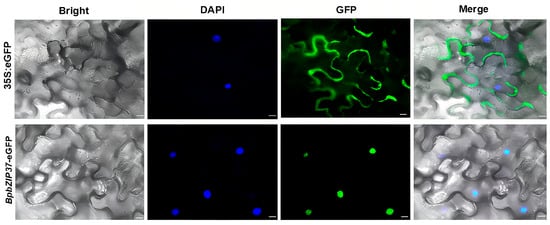 To investigate the biological function of BpbZIP37, a vector of 35S:BpbZIP37-eGFP-tNOS was constructed and introduced into N. benthamiana by Agrobacterium-mediated transformation for transient expression and subcellular localization analysis of BpbZIP37. The results showed that BpbZIP37 was successfully transiently expressed in N. benthamiana, and the expressed protein is mainly localized in the nucleus, which is consistent with the subcellular localization of most transcription factors (Figure 6).