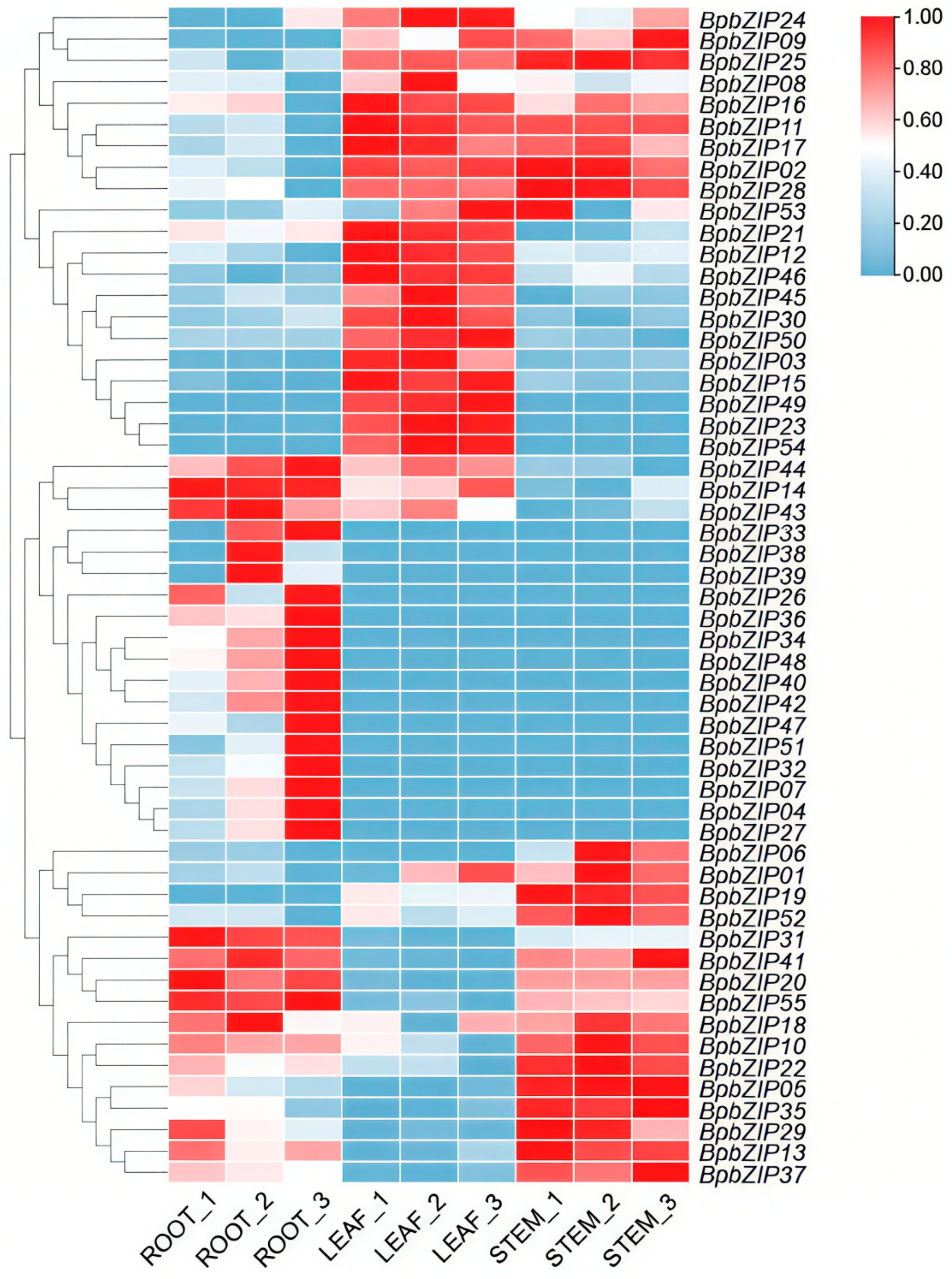 2.3. Expression Pattern Analysis of BpbZIP Genes in Different Tissues of B. purpurascens