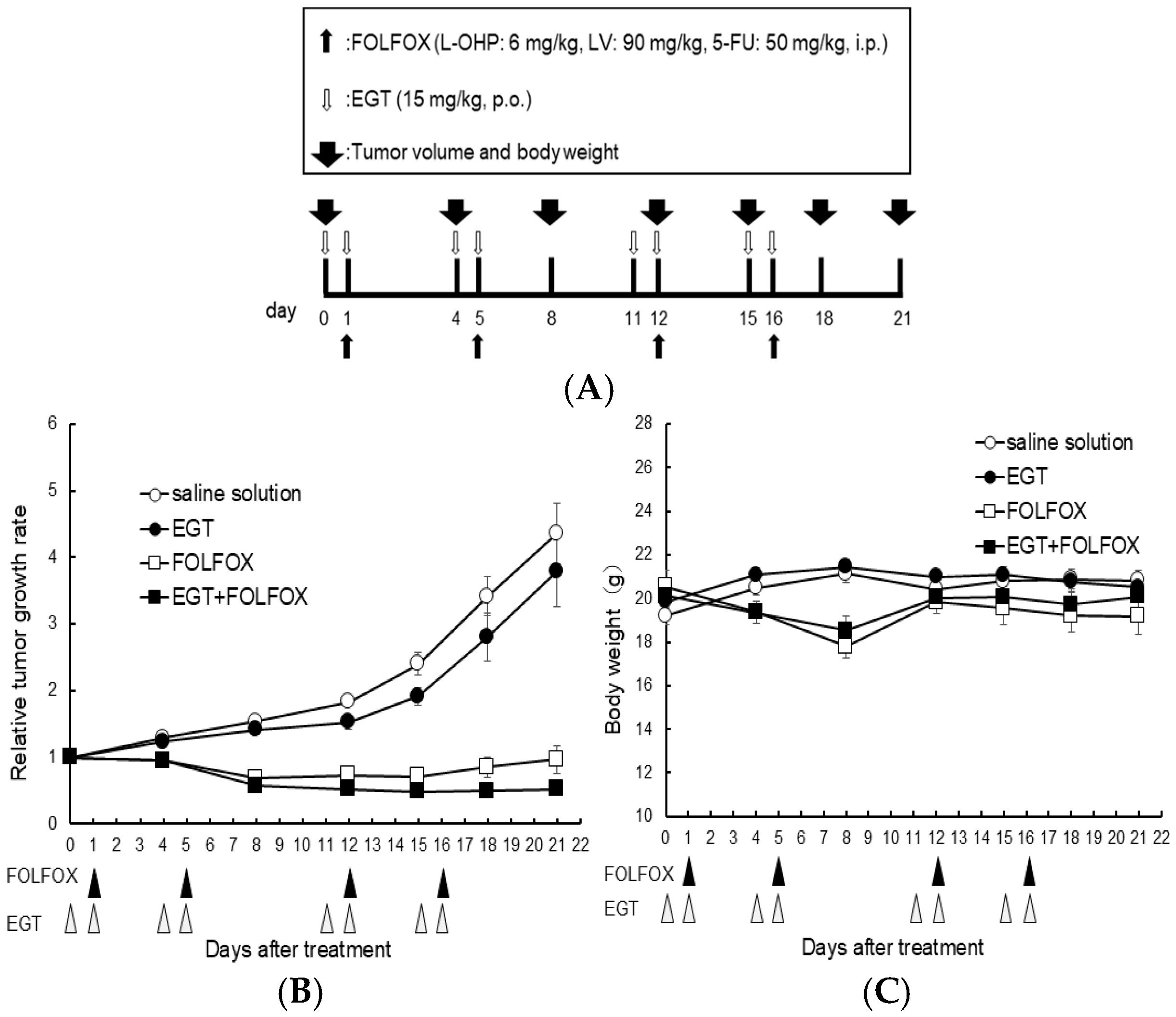 2.3. EGT Does Not Adversely Affect the Antitumor Effect of L-OHP