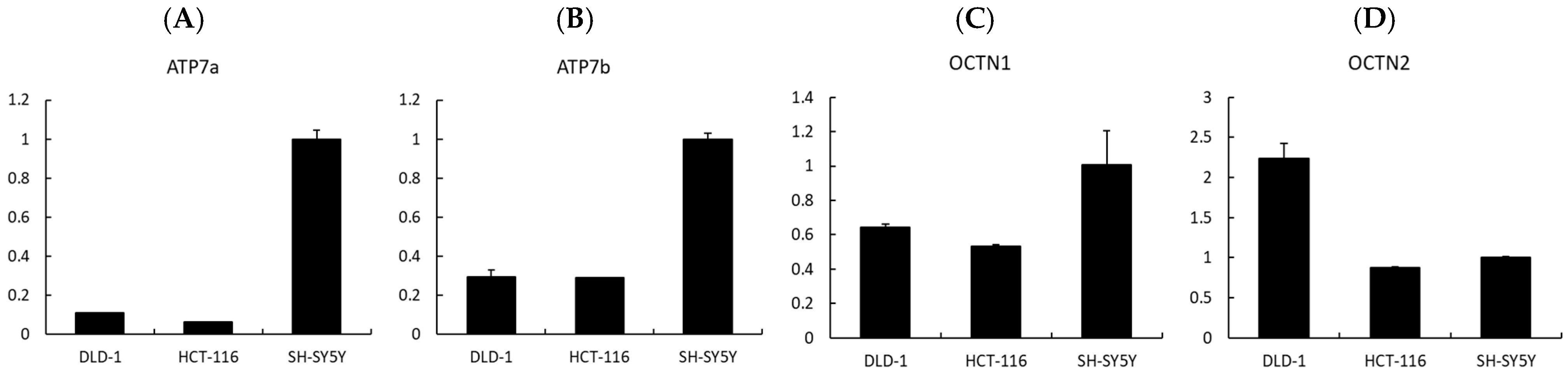 - Sugiura, T.; Kato, S.; Shimizu, T.; Wakayama, T.; Nakamichi, N.; Kubo, Y.; Iwata, D.; Suzuki, K.; Soga, T.; Asano, M.; et al. Functional expression of carnitine/organic cation transporter OCTN1/SLC22A4 in mouse small intestine and liver. Drug Metab. Dispos. 2010, 38, 1665–1672. [Google Scholar] [CrossRef]