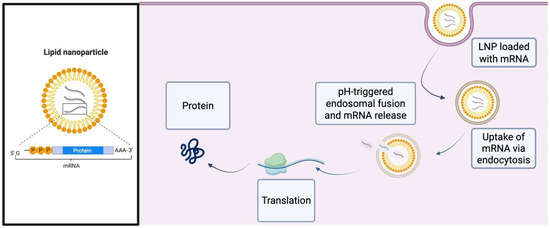 A simplified schematic illustrating how encapsulation of mRNA in lipid nanoparticles protects the payload from enzymatic degradation and immune detection, enhances cellular internalization, triggers pH-dependent lipid protonation for endosomal escape, and ultimately permits robust cytosolic translation of the encoded therapeutic protein. Abbreviations: LNP, Lipid Nanoparticle; mRNA, messenger ribonucleic acid; pH, potential of Hydrogen.