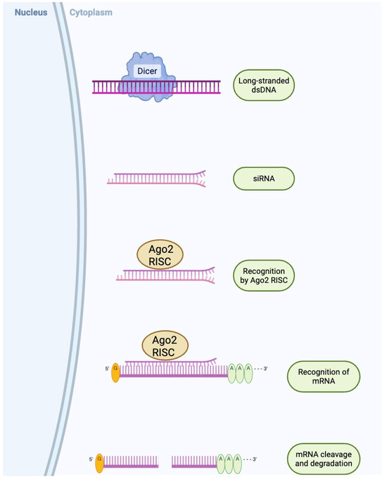 The process of RNA interference in eukaryotes. The siRNA pathway constitutes of double-stranded RNA (dsRNA) being cleaved by the dicer enzyme into siRNA, which are then recognized by the Ago-RISC, where one strand is then degraded and the other strand guides the complex to degrade complementary mRNA sequences [45]. Abbreviations: dsRNA, double-stranded ribonucleic acid; mRNA, messenger ribonucleic acid; Ago2, Argonaute 2; RISC, RNA-induced silencing complex.