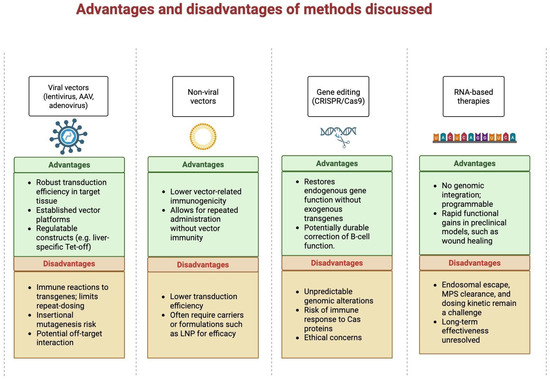 Advantages and limitations of principal delivery modalities and RNA therapeutics used in diabetes gene therapy. Each card summarizes primary benefits and key concerns for: viral vectors, non-viral systems, gene editing (CRISPR/Cas9), and RNA-based strategies (mRNA/siRNA with LNP delivery). This schematic highlights trade-offs between transduction efficiency, durability, immunogenicity and translational feasibility. Abbreviations: CAS (CRISPR-associated protein); MPS, (mononuclear phagocyte system).