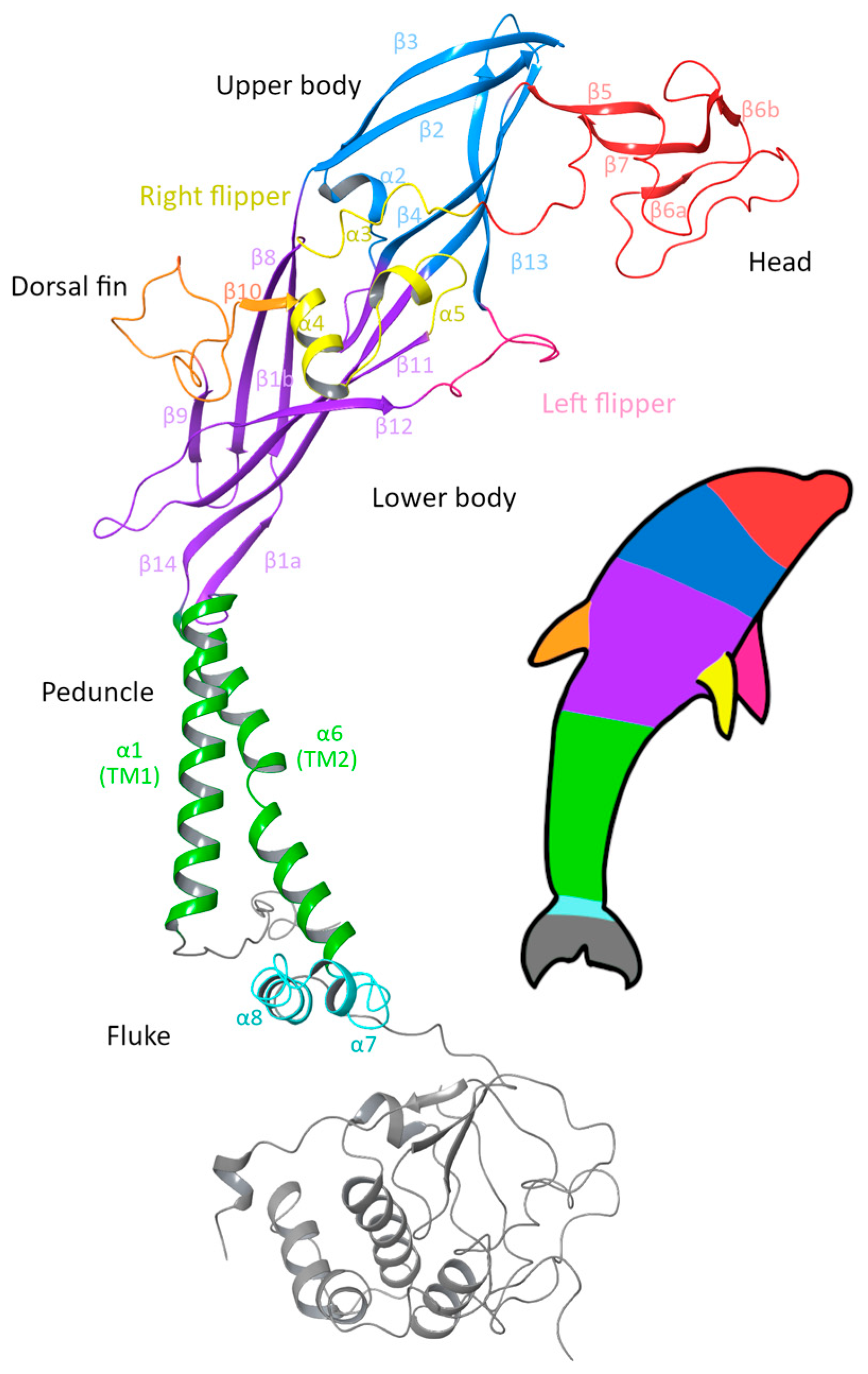 Figure 1. Ribbon diagram of a single subunit of the P2X7 receptor (P2X7A) with the updated dolphin representation to reflect the new structural findings of the intracellular domain. The head region (red), upper body (blue) and lower body (purple) form the extracellular domain, together with the dorsal fin (orange), right flipper (yellow) and left flipper (pink). The peduncle (green) corresponds to the two transmembrane helices, which link to the fluke corresponding to the C-cys anchor (cyan) and the cytoplasmic ballast (grey) that form the intracellular domain. Figure generated using Maestro 14.0 [44] with PDB ID 6U9W [39].