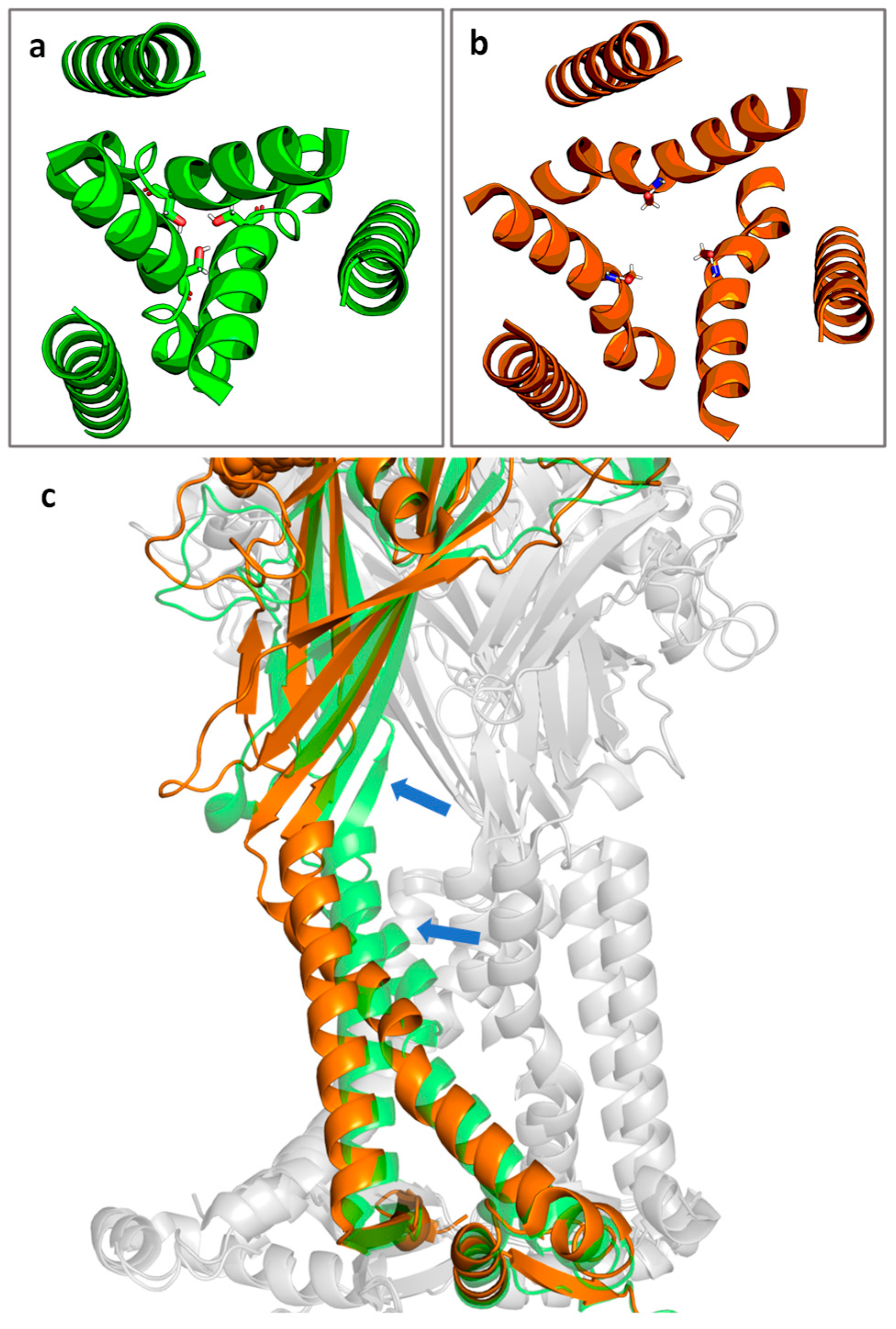 The P2X7R is gated by extracellular ATP. Channel opening results from movement of the TM gate which consists of residues S339 to S342, with the key residue S342 contributing to the narrowest part of the channel (Figure 2a,b) [39]. After agonist binding, the binding pocket undergoes a conformational change. The β strands of the extracellular domain flex outward, pulling the TM2 domains away from the channel lining and opening the channel (Figure 2c) [39].