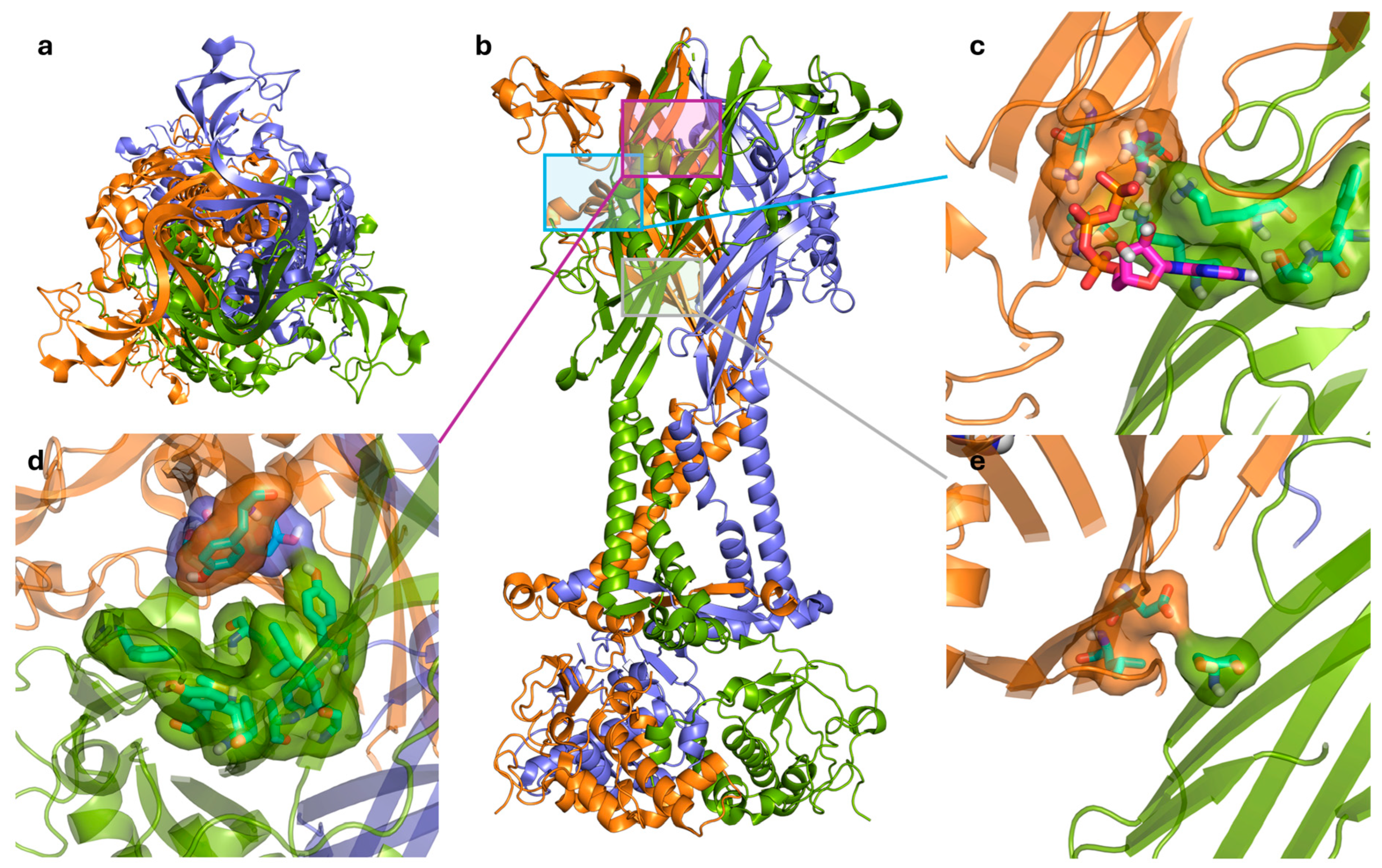 Figure 3. (a) Top view of the trimeric P2X7R in the open state showing the three subunits colored green, orange, and blue. (b) Side view of the receptor illustrating the transmembrane and extracellular domains, with boxed regions indicating the (c) ATP-binding site with the ATP molecule, the (d) central negative allosteric modulator binding site, and the (e) proposed positive allosteric modulator binding site. Ligands and interacting residues are shown in stick and surface representations, emphasizing key hydrogen bonds and hydrophobic contacts. Figure generated using PyMOL [45] with PDB IDs 6U9W (open state), 8TR5 (closed state), and 8TR6 (closed state with negative allosteric modulator A438079 bound) [39,40,41].