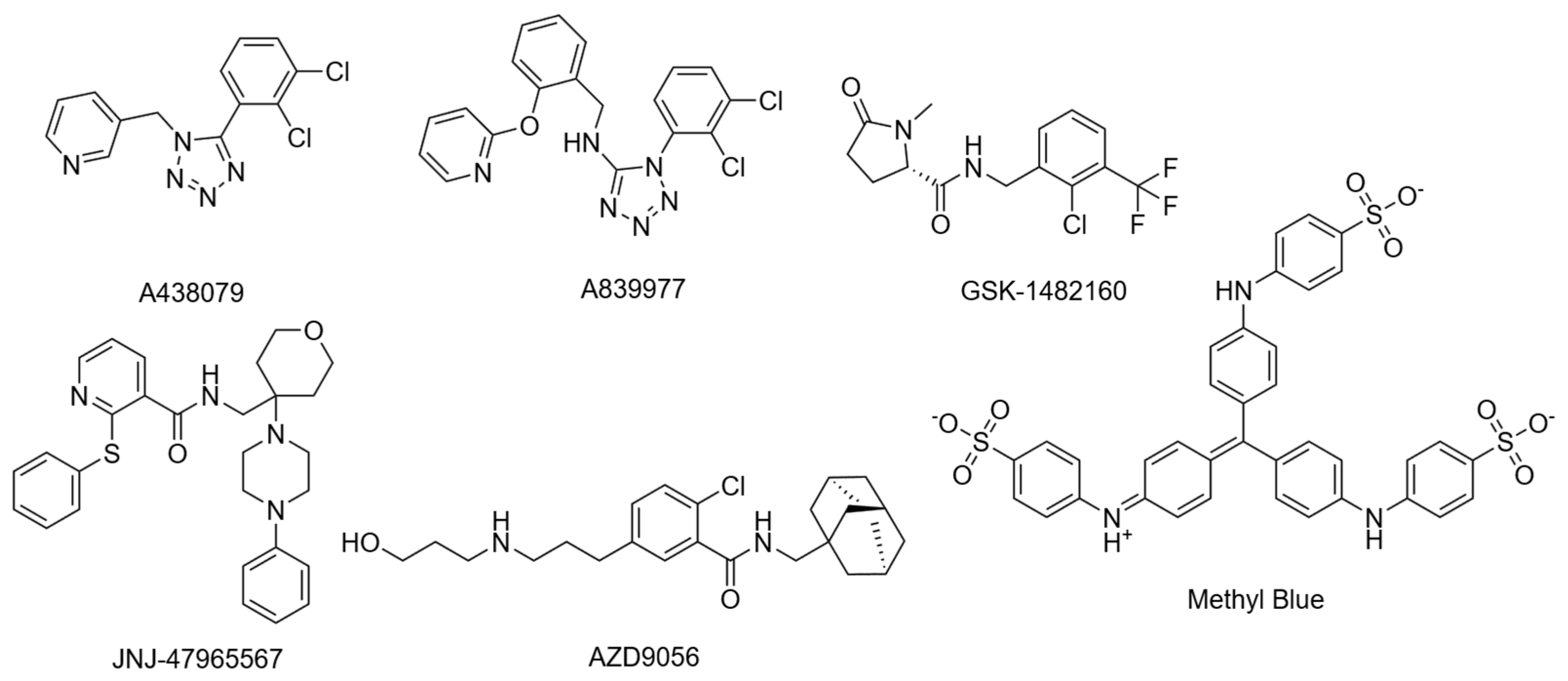 Cryo-EM structures were recently resolved for the rP2X7R with six noncompetitive negative allosteric modulators (NAMs): A438079, A839977, AZD9056, GSK1482160, JNJ47965567, and methyl blue (Figure 4) [41]. The study observed an inter-subunit hydrophobic pocket that is distinct from the orthosteric ATP-binding site [41]. All structurally characterised NAMs bound to the inter-subunit hydrophobic pocket, consisting of residues F88, L95, F103, M105, Y108, F293, Y295, Y298, I310, and A312 of the rP2X7R (Figure 3d) [41]. Hydrogen bonding with residues D92 and K297 was also observed; however, this was highly variable between NAMs due to their chemical diversity [41]. The cryo-EM mapping of this pocket was in agreement with earlier mutational, functional, and structural studies, which identified amino acid residues involved in NAM binding [34,41,63]. Seven of the ten listed residues are conserved in the hP2X7R, with the three differing residues being F95, F108, and V312. Structural analysis showed that this hydrophobic pocket usually shrinks upon ATP binding, and NAMs prevent this conformational change, consequently inhibiting receptor function [34,41]. Importantly, the study by Oken et al. also noted that NAMs bind within the extracellular domain pocket, and direct contacts are absent in TM and intracellular domains [41]. There are some differences in antagonist characteristics between species. For example, the P2X7R antagonist Brilliant Blue G (BBG) is more potent in blocking calcium uptake in the rat receptor than the human receptor [62]. On the other hand, BBG can block the dye uptake of both species [62]. It was observed that residue F95 of the hP2X7R was important in forming pi-stacking interactions that the rP2X7R did not have [64]. However, they also noted that this change does not completely account for the differences in antagonistic effect, which warrants further investigation [64]. Cryo-EM studies suggest that V312 in the hP2X7R occupies more space, and alters the conformation of Y295, providing a structural basis for species-specific differences. These variations in allosteric sites are important to consider, as they can affect a drug’s translation to human studies. For a comprehensive structural analysis of these conformational states, readers are referred to the work by Oken et al. [31].
