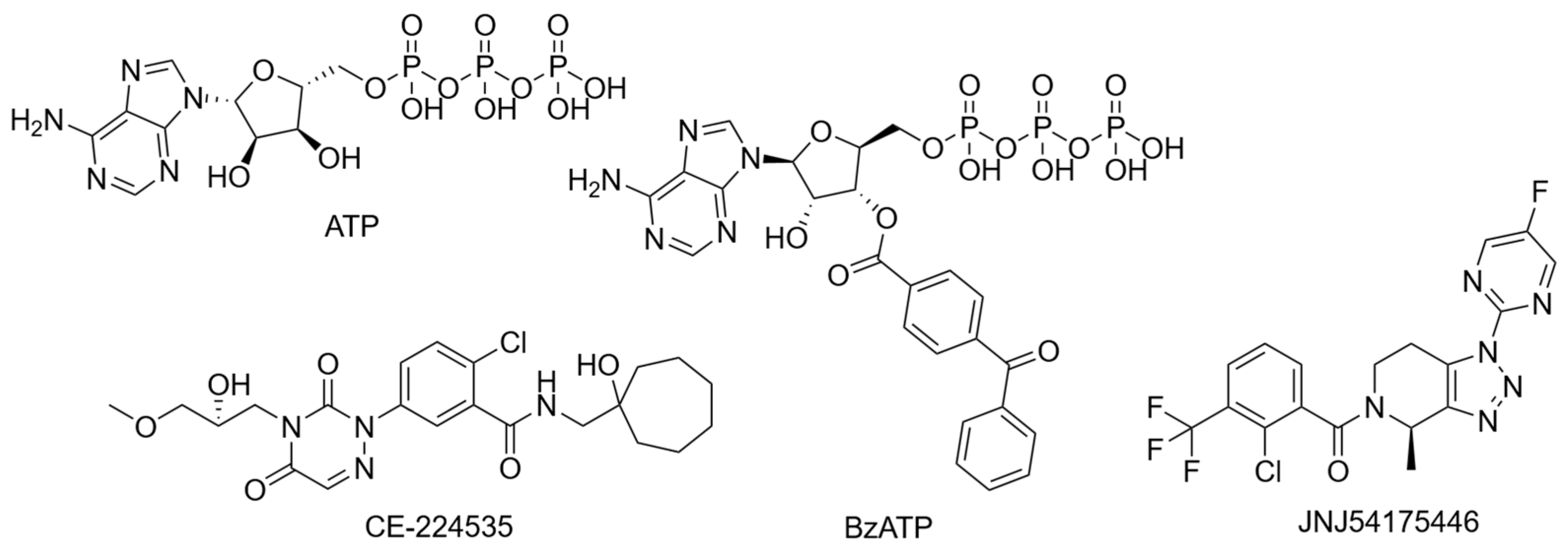 Figure 5. Structures of frequently used agonists (ATP and BzATP) as well as antagonists used in clinical trials.