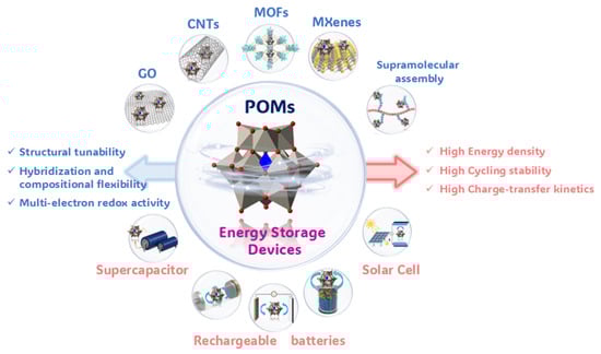 Benefiting from these unique compositional and structural properties, POMs exhibit well-defined molecular configurations, abundant redox-active sites, and highly tunable electronic structures [,]. These attributes make them promising candidates for electrochemical energy storage. Rational molecular design and nanostructural control can enhance the electrical conductivity, structural stability, and ion transport kinetics of POM-based materials, thereby improving their electrochemical performance. The structural and compositional diversity of POMs-incorporating multiple redox-active metal centers (e.g., Mo5+/6+, W5+/6+, and V4+/5+) allows for precise tuning of redox potentials at the molecular or even atomic level []. Their exceptional multi-electron storage capability, often termed “electron sponge” behavior, enables additional capacity through reversible multi-electron transfers [,]. Owing to these advantages, POM-based functional nanomaterials show broad application prospects in various energy storage devices, including solar cells [,,], lithium-ion batteries [,,,], lithium–sulfur batteries [,], sodium-ion batteries [,,], and supercapacitors [,,,].