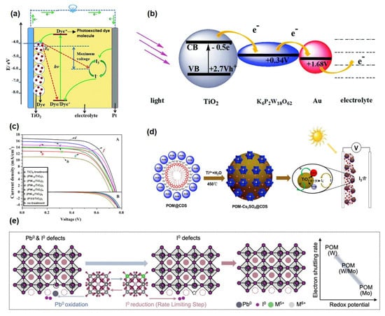 Solar energy, recognized as one of the most promising renewable energy sources, is increasingly considered a viable alternative to conventional fossil fuels due to its cleanliness, sustainability, and wide distribution. Among solar energy conversion technologies, dye-sensitized solar cells (DSSCs) have attracted significant research interest owing to their simple fabrication, low cost, and environmental friendliness [,,]. As shown in Figure 4a, the operational mechanism of DSSCs involves several key steps: photosensitive dyes absorb photons, exciting electrons from the ground state to a higher energy level []. These excited electrons are subsequently injected into the conduction band (CB) of a semiconductor (e.g., TiO2), leading to charge separation. Electrons in the CB are then transported through the semiconductor to the external circuit, while the oxidized dye molecules are regenerated to their original state by reductants in the electrolyte, thereby completing the photoelectric conversion cycle. However, the power conversion efficiency of DSSCs remains limited by intrinsic challenges such as severe charge recombination and narrow light-harvesting ranges [,]. Recently, POMs have emerged as promising functional materials in DSSCs due to their unique electronic structures, tunable energy levels, and exceptional photoelectrochemical properties [,,,]. Based on their distinct functional roles in DSSCs, POMs can be systematically categorized into the following types: photosensitizers or electron acceptor materials [,], electrolytes or electrolyte additives [,], interfacial/electron transport layers [,,], and photoanode modifiers [,,].