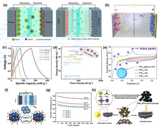 Supercapacitors represent a class of energy storage devices that bridge the gap between conventional capacitors and batteries, offering high power density (≥10 kW/kg), long cycle life, and rapid energy storage/release capabilities [,,]. Energy storage mechanisms primarily include electric double-layer capacitance (EDLC), based on ion adsorption at the electrode-electrolyte interface, and pseudocapacitance, which relies on fast and reversible surface or near-surface Faradaic reactions [,,]. EDLC stores charge via electrostatic accumulation in the double layer, while pseudocapacitance involves redox reactions or electrosorption in electrode materials (Figure 5a) [,,]. POMs have emerged as promising pseudocapacitive electrode materials due to their rich redox activity, structural tunability, and molecular-scale controllability. POMs facilitate multi-electron transfer processes, significantly enhancing pseudocapacitive performance [,]. Moreover, their molecular design can be tailored to improve compatibility with electrode substrates and ion transport kinetics, leading to superior capacitive performance and cycling stability. Based on the primary functions of POMs in different components, their applications can be categorized into the following types: electrode active material [,,,,], synergistic component in composite electrodes [], and electrolyte functional additive or hydrogel electrode [,,].
