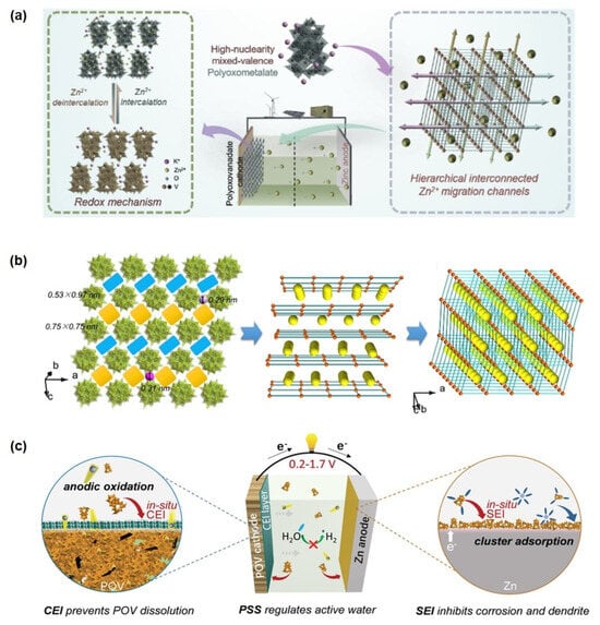 (a) Energy storage mechanism diagram of a high−nuclearity mixed-valence POM with hierarchically interconnected Zn2+ migration channels. (b) Topologic images of hierarchical interconnected channels. Reprinted with permission from Ref. [], Copyright 2020, Nano Energy. (c) Multifunctionality illustrations of the POV cluster. Reprinted with permission from Ref. [], Copyright 2022, Advanced Energy Materials.