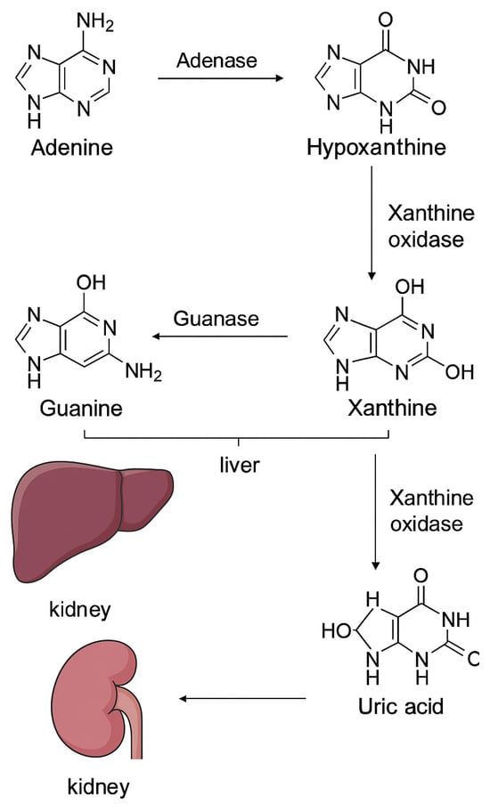 - Cicero, A.F.G.; Fogacci, F.; Di Micoli, V.; Angeloni, C.; Giovannini, M.; Borghi, C. Purine Metabolism Dysfunctions: Experimental Methods of Detection and Diagnostic Potential. Int. J. Mol. Sci. 2023, 24, 7027. [Google Scholar] [CrossRef]