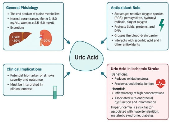 Roman-Filip, I.; Roman-Filip, C.; Morosanu, V.; Andone, S.; Bajko, Z.; Balasa, R. Uric Acid in Cerebral Ischemia: A Systematic Review of Its Biomarker Value and Role in Neuroprotection. Int. J. Mol. Sci. 2025, 26, 10268. https://doi.org/10.3390/ijms262110268