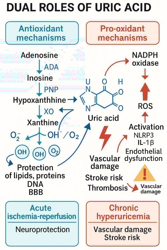 - Xu, L.; Li, C.; Wan, T.; Sun, X.; Lin, X.; Yan, D.; Li, J.; Wei, P. Targeting uric acid: A promising intervention against oxidative stress and neuroinflammation in neurodegenerative diseases. Cell Commun. Signal. 2025, 23, 4. [Google Scholar] [CrossRef]