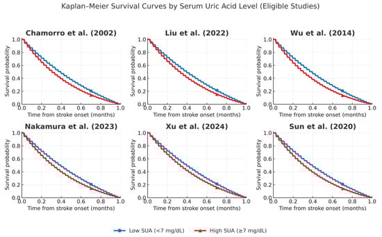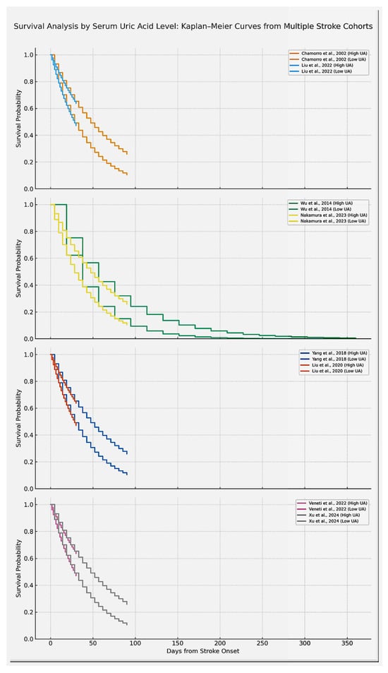 - Nakamura, K.; Ueki, K.; Matsuo, R.; Kiyohara, T.; Irie, F.; Wakisaka, Y.; Ago, T.; Kamouchi, M.; Kitazono, T.; on Behalf of the Fukuoka Stroke Registry Investigators. Association between decreases in serum uric acid levels and unfavorable outcomes after ischemic stroke: A multicenter hospital-based observational study. PLoS ONE 2023, 18, e0287721. [Google Scholar] [CrossRef]