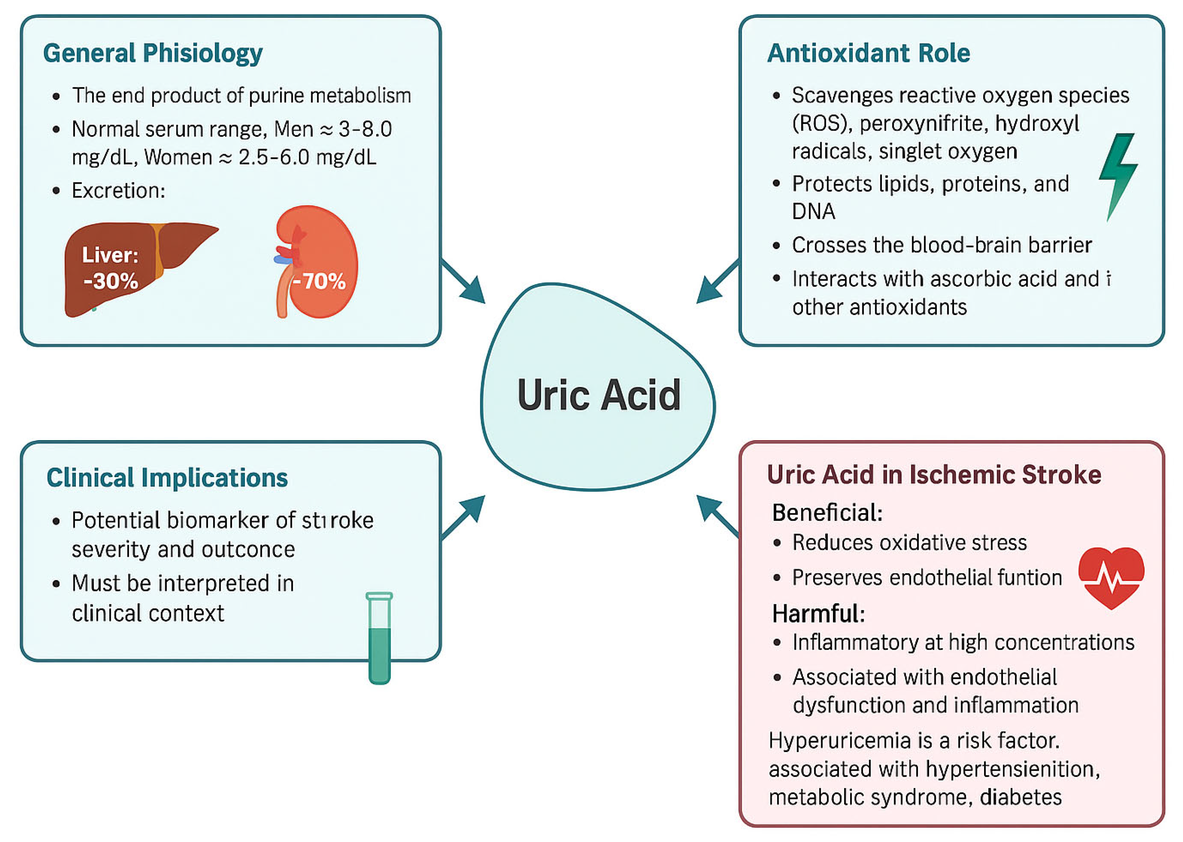 - Das, A.; Rahman, M.M.; Baker, I.M.; Talukder, S.; Najnin, F.; Akhter, R. Serum Uric Acid Level in Acute Stroke Patient: Study of 100 Cases. Sch. J. Appl. Med. Sci. 2022, 10, 222–227. [Google Scholar] [CrossRef]