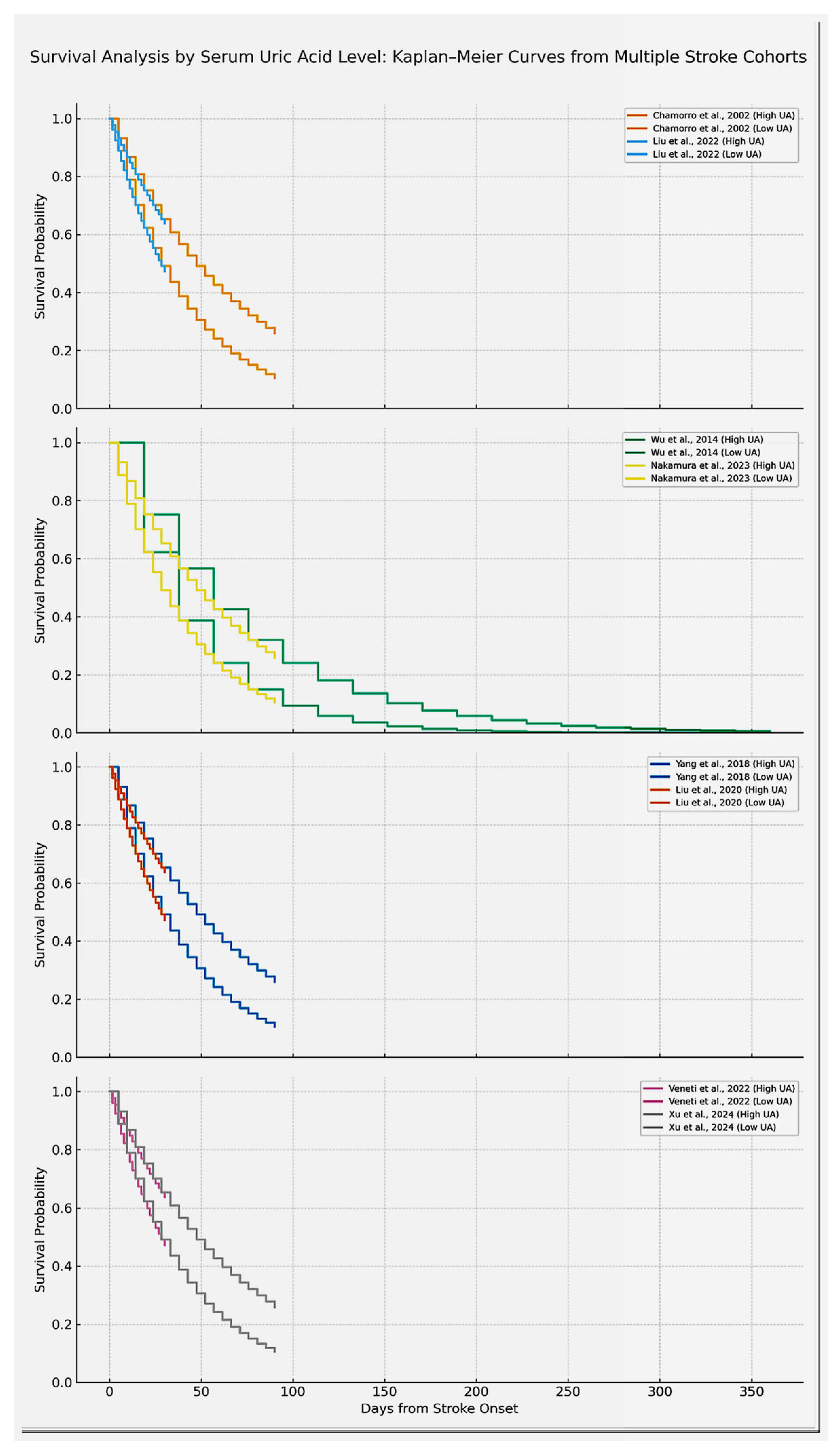 - Zhong, J.; Cai, H.; Zhang, Z.; Wang, J.; Xiao, L.; Zhang, P.; Xu, Y.; Tu, W.; Zhu, W.; Liu, X.; et al. Serum uric acid and prognosis of ischemic stroke: Cohort study, meta-analysis and Mendelian randomization study. Eur. Stroke J. 2024, 9, 235–243. [Google Scholar] [CrossRef]