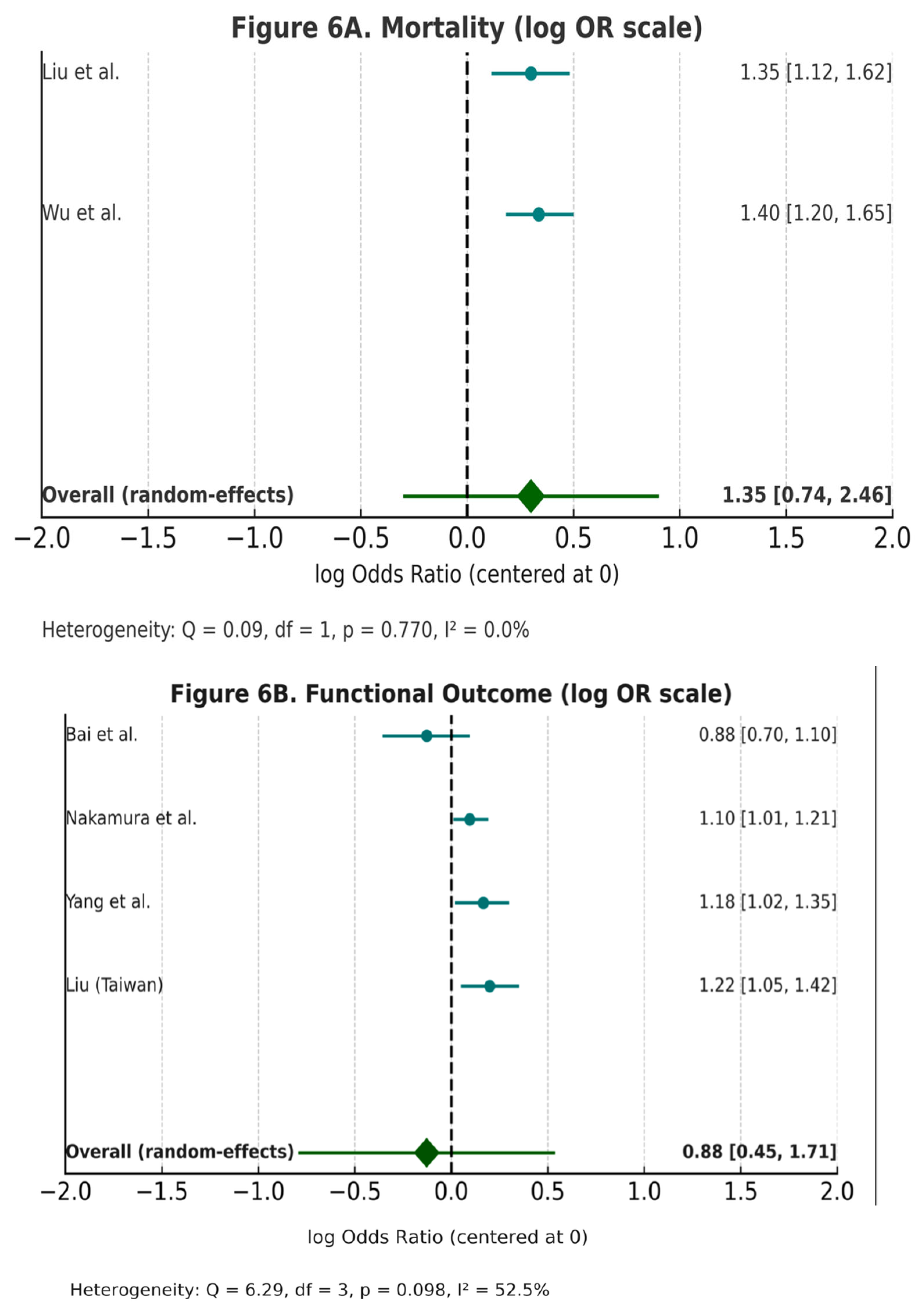 | Nakamura et al. (2023) [12] | Japan | 4621 | Acute Ischemic | Decrease rate from baseline | mRS ≥ 3 and 3–5 at 3 months; 3 months |