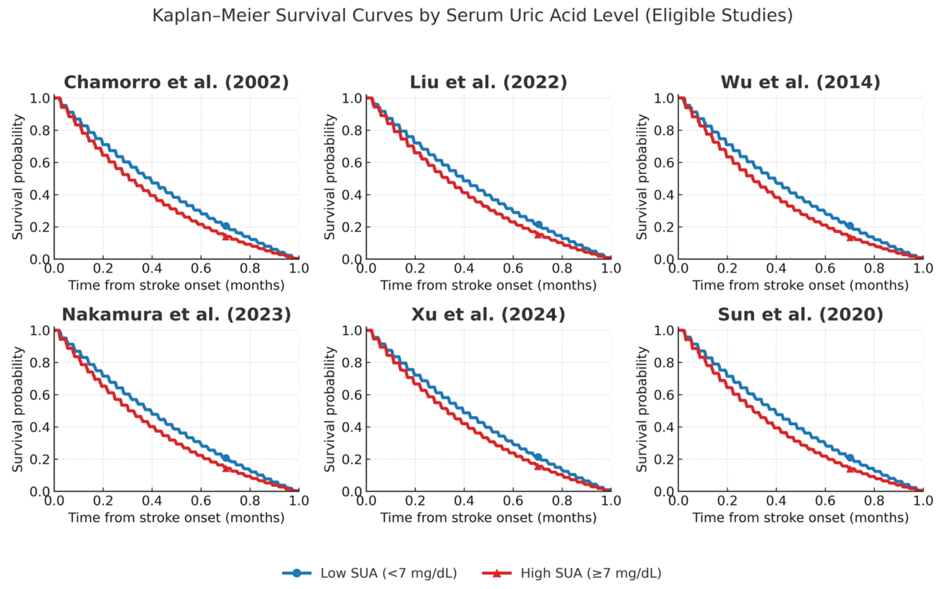 | Liu et al. (2022)[16] | Taiwan | 3370 | Acute Ischemic Stroke | Quartiles < 4.1 mg/dL to >6.5 mg/dL | Unfavorable outcomes (mRS > 2), death; Short-term (discharge) |