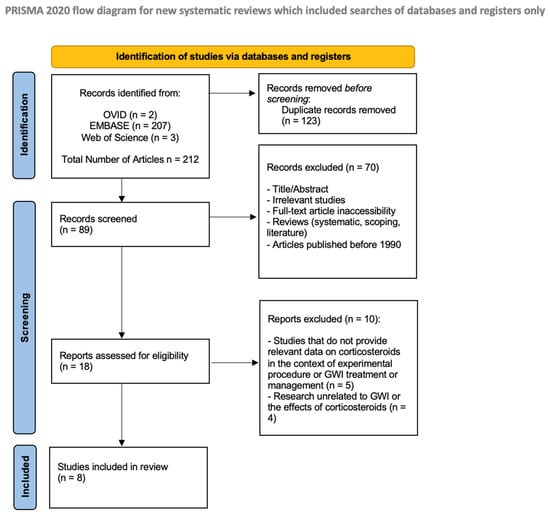 In total, 212 articles were extracted from the databases Ovid MEDLINE, EMBASE, and Web of Science based on keyword searches. After the first-tier screening, 123 duplicate articles were removed, and an additional 70 articles were also excluded based on title and abstract, lack of full-text availability, study type, and publication year before 1990. Review articles were all excluded. Additionally, if the study was irrelevant to corticosteroids and any possible relationship with GWI, it was excluded. Eighteen articles that remained after the first-tier screening underwent full-text screening. During tier II review, eight studies were excluded, five of which were found to not provide relevant data on corticosteroids in the context of GWI treatment or management. The other four articles were unrelated to GWI and its relationship to corticosteroids. After the full-text screening (tier II review), only eight articles remained to be analyzed for eligibility and inclusion into the study. Table 1 depicts the studies included in the analysis between GWI and corticosteroids.