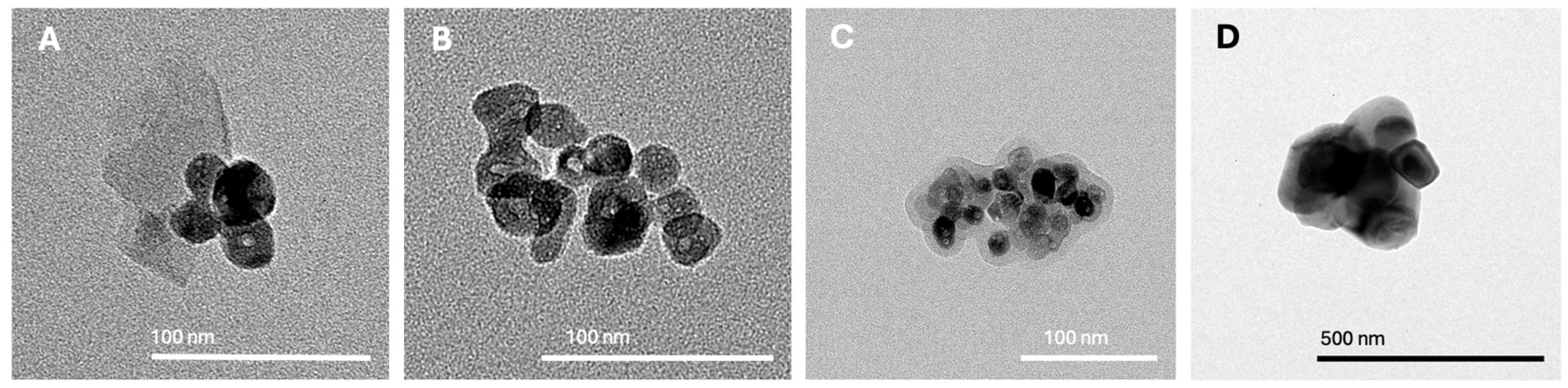 - Ivask, A.; Kurvet, I.; Kasemets, K.; Blinova, I.; Aruoja, V.; Suppi, S.; Vija, H.; Käkinen, A.; Titma, T.; Heinlaan, M.; et al. Size-Dependent Toxicity of Silver Nanoparticles to Bacteria, Yeast, Algae, Crustaceans and Mammalian Cells In Vitro. PLoS ONE 2014, 9, e102108. [Google Scholar] [CrossRef]