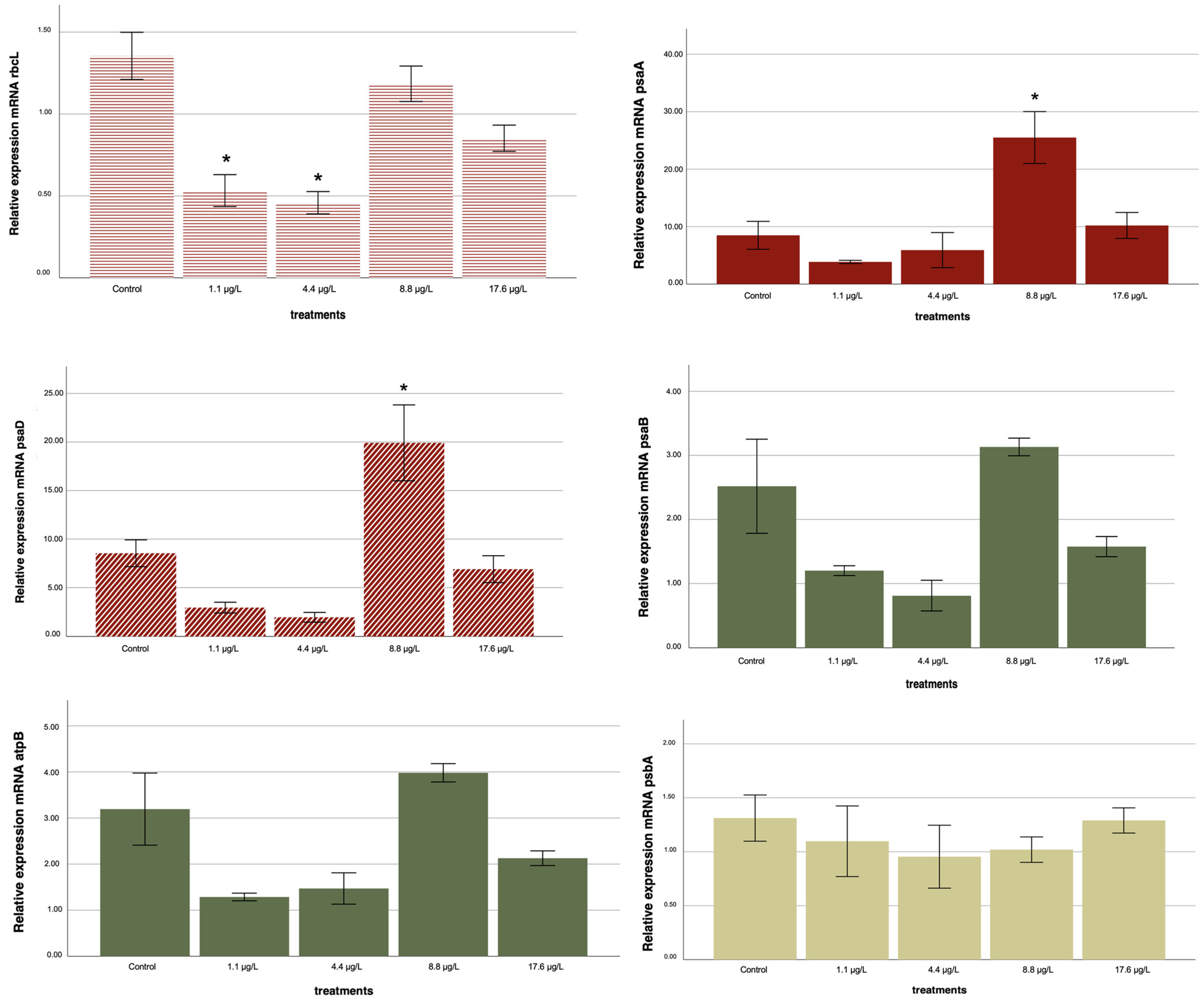 | rbcL | Control | 1.1 µg/L | 0.823 * | 0.169 | 0.002 | 0.301 | 1.3441 |