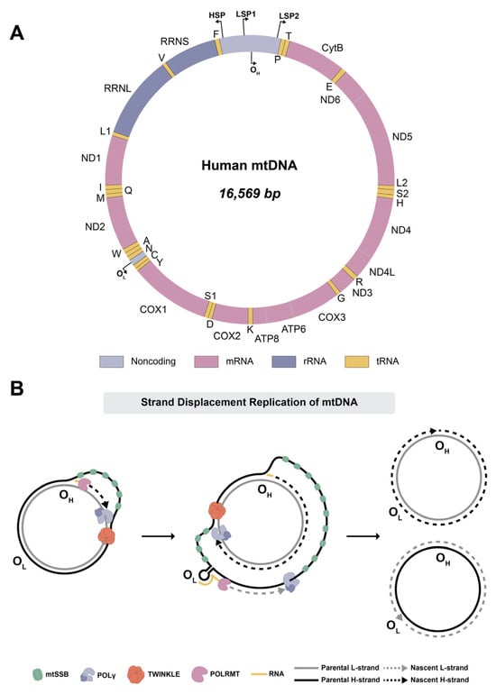 Similar to bacterial chromosomal DNA, mtDNA is organized into nucleoprotein complexes, known as nucleoids, which are located in the inner mitochondrial matrix. Within these nucleoids, mtDNA is compacted by different proteins, with the most abundant being transcription factor A, mitochondrial (TFAM) [13,14]. Human mtDNA consists of two strands, termed heavy strand (H-strand) and light strand (L-strand) due to their strand bias in nucleotide composition. The H-strand has a higher content of guanine and thymine nucleotides compared to the L-strand, allowing these strands to be separated by density gradient centrifugation in alkaline cesium chloride [15,16]. MtDNA also contains a noncoding region (NCR) of 1121 nucleotides that harbors the promoter regions for transcription initiation for both the H-strand and the L-strand, as well as the origin of replication for the H-strand (OH) [17] (Figure 1A). Within the NCR, a linear DNA strand exists, referred to as 7S DNA based upon its sedimentation characteristics. The 7S DNA is approximately 650 nucleotides in length and forms a displacement loop (D-loop). Although the exact function of the D-loop is currently unknown, several studies have proposed that the D-loop might play a role in nucleoid organization and may be involved in the regulation of mtDNA replication [18].