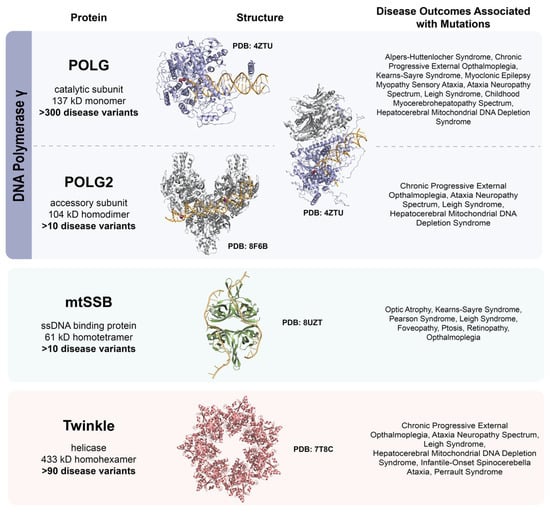 Structures of the minimal mitochondrial DNA replication machinery and the disease outcomes associated with mutations. The replicative polymerase, pol γ, is comprised of PolG, the catalytic subunit, and PolG2, the accessory subunit. The catalytic subunit alone is represented in PDB: 4ZTU bound to DNA. The accessory subunit bound to DNA as a trimer of dimers is represented in PDB: 8F6B. The holoenzyme in complex with DNA is shown in PDB: 4ZTU. Mitochondrial single-stranded binding protein bound to DNA is shown in PDB: 8UZT. The Twinkle helicase is represented in PDB: 7T8C.
