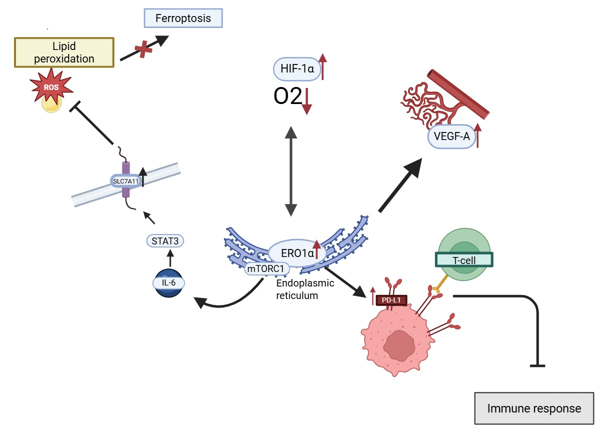 - Wang, Z.; Zong, H.; Liu, W.; Lin, W.; Sun, A.; Ding, Z.; Chen, X.; Wan, X.; Liu, Y.; Hu, Z.; et al. Augmented ERO1α upon mTORC1 Activation Induces Ferroptosis Resistance and Tumor Progression via Upregulation of SLC7A11. J. Exp. Clin. Cancer Res. 2024, 43, 112. [Google Scholar] [CrossRef]