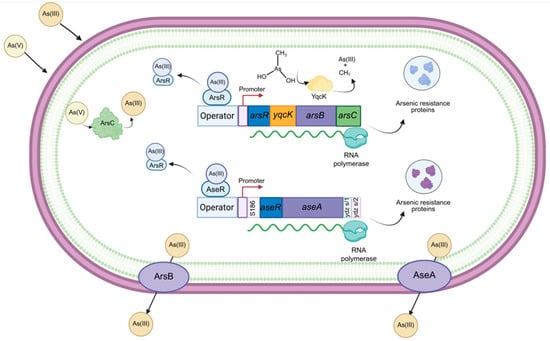 In addition to the genes described in the ars and ase operons, additional determinants of As resistance have been identified in bacteria of the genus Bacillus, including aioAB, aioXRS, arrAB, aioS, and arsD; however, arsH and arsM detected in other genera are absent from the Bacillus species.