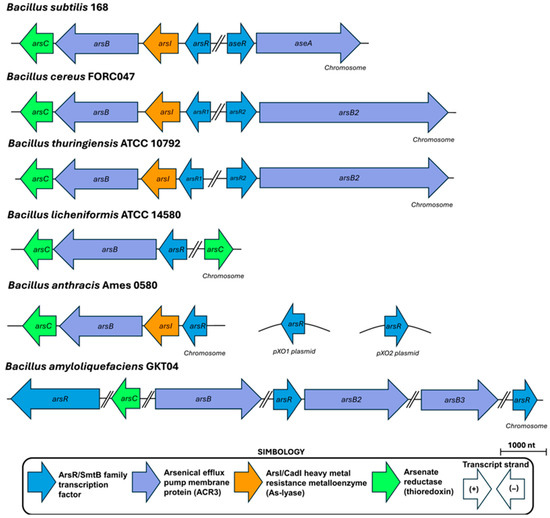 Genetic organization of As response operons in B. subtilis and related species within the Bacillus genus. Genes are represented by arrows of varying sizes and colors, corresponding to their base pair length and known function. The arrow orientation indicates the transcribed strand. The species name is accompanied by the reference genomes used for the analysis, and the accession numbers for each gene analyzed are listed in Table S1 in the Supplementary Material. Drawing is to scale.