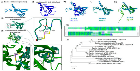 Structural comparison and phylogenetic analyses of different transcriptional repressors of As-responsive operons. (A,B) AlphaFold-predicted 3D structures of B. subtilis (A) ArsR (AF-P45949-F1-v4) and (B) AseR (AF-P96677-F1-v4). (C,D) Experimentally resolved 3D structures of (C) A. ferrooxidans ArsR (PDB: 6J05) and (D) C. glutamicum ArsR (PDB: 6J0E), with enlarged boxes highlighting cysteine residues critical for As(III) binding. (E) Structural overlay between B. subtilis ArsR (light blue) and AseR (dark blue). (F) Structural overlay of B. subtilis ArsR (blue) and A. ferrooxidans ArsR (green). (G) Structural overlay of B. subtilis ArsR (blue) and C. glutamicum ArsR (green). (H) Amino acid sequence alignment of As-responsive operon repressor proteins; identical residues are shaded with the same color. Alignment is colored in a buried index fashion where darker blue/purple tones indicate deeper burial, while lighter green hues reflect greater exposure. PyMOL (v. 2.3.3.) was used for structure visualization and Clustal Omega (v. 1.2.2.) was used for sequence alignment. (I) Evolutionary relationships between various ArsR repressor proteins from Bacillus species and other bacteria. The phylogenetic tree was constructed using MEGA12 (v. 12.0.14) software with the amino acid sequences reported in the Table S1 in Supplementary Material. The tree is constructed to scale. Branch lengths are measured by the number of substitutions per site.