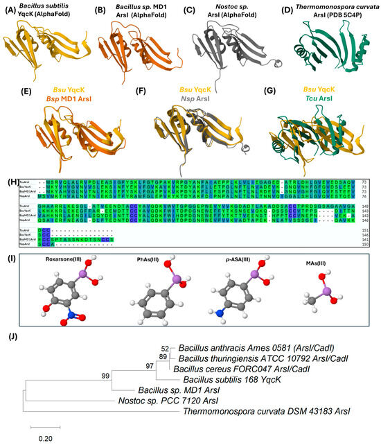 Structural comparison and phylogenetic analysis of bacterial As-lyase proteins. (A–C) AlphaFold-predicted 3D structures of (A) B. subtilis YqcK, (B) Bacillus sp. MD1 ArsI, and (C) Nostoc sp. ArsI. (D) Experimentally resolved 3D structure of T. curvata ArsI (PDB: 5C4P). (E) Structural comparison between B. subtilis YqcK (yellow) and Bacillus sp. MD1 ArsI (orange). (F) Structural comparison between B. subtilis YqcK (yellow) and Nostoc sp. ArsI (gray). (G) Structural comparison between B. subtilis YqcK (yellow) and T. curvata ArsI (green). (H) Amino acid sequence alignment of As-lyase proteins; identical residues are shaded with the same color. Alignment is colored in a buried index fashion where darker blue/purple tones indicate deeper burial, while lighter green hues reflect greater exposure. PyMOL (v. 2.3.3.) was used for structure visualization and Clustal Omega (v. 1.2.2.) for sequence alignment. (I) Structures of organoarsenical compounds: roxarsone (III), phenylarsenite (III), p-arsanilic acid (III), and methylarsenite (III), which are known substrates of the ArsI protein from T. curvata. Molecular structures of substrates were rendered using MolView (URL: https://molview.org; accessed on 28 July 2025). (J) Evolutionary relationships between various As-lyase proteins from Bacillus species and other bacteria. The phylogenetic tree was constructed using MEGA12 (v. 12.0.14) software with the amino acid sequences reported in Table S1 in the Supplementary Material. The tree is constructed to scale. Branch lengths are measured by the number of substitutions per site.