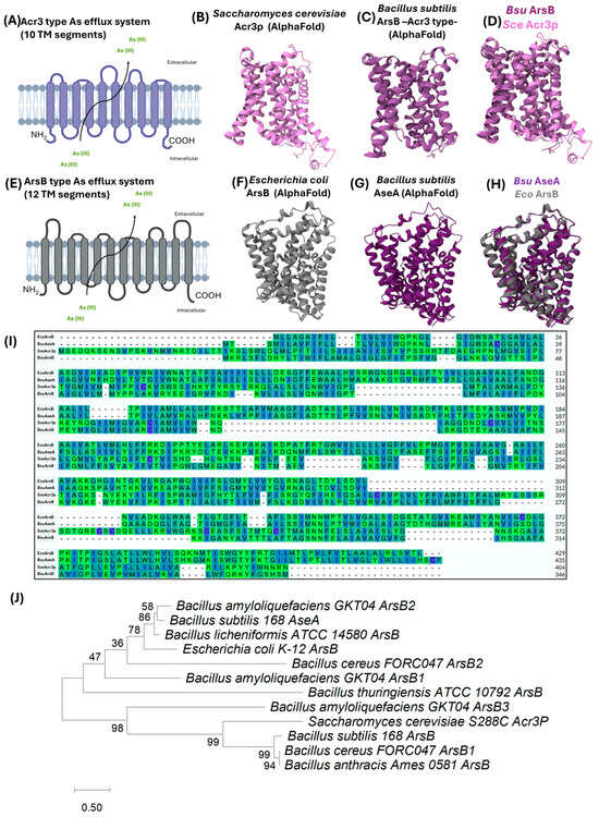 Transmembrane domains, sequence, structural comparative, and phylogenetic analysis of As(III) efflux system proteins. (A) Topological arrangement of Acr3-type As(III) efflux transporters containing 10 transmembrane segments. (B,C) AlphaFold-predicted 3D structures of Acr3-type proteins: (B) S. cerevisiae Acr3p and (C) B. subtilis ArsB. (D) Structural comparison between B. subtilis ArsB (magenta) and S. cerevisiae Acr3p (light purple). (E) Topological arrangement of ArsB-type As(III) efflux transporters containing 12 transmembrane segments. (F,G) AlphaFold-predicted 3D structures of ArsB-type proteins: (F) Escherichia coli ArsB and (G) B. subtilis AseA. (H) Structural comparison between E. coli ArsB (gray) and B. subtilis AseA (dark purple). (I) Amino acid sequence alignment of As(III) efflux system proteins; identical residues are shaded with the same color. The alignment is colored by burial index (darker blue/purple: buried residues; lighter green: solvent-exposed residues). PyMOL (v. 2.3.3.) was used for structure visualization, and Clustal Omega (v. 1.2.2.)was used for sequence alignment. (J) Evolutionary relationships between various As efflux pump proteins from Bacillus species and other bacteria. The phylogenetic tree was constructed using MEGA12 (v. 12.0.14) software with the amino acid sequences reported in Table S1 in the the Supplementary Material. The tree is constructed to scale. Branch lengths are measured by the number of substitutions per site.
