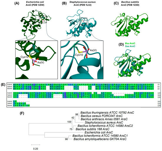 Structural comparative and phylogenetic analysis of different As (V) reductase proteins. (A–C) Experimentally resolved 3D structures of (A) E.coli ArsC (PDB: 1JZW); (B) S. aureus ArsC (PDB:1LJU) and (C) B. subtilis ArsC (PDB: 1Z2D). Enlarged boxes in (B,C) highlight cysteine residues critical for As(V) binding. (D) Structural overlay between B. subtilis ArsC (green) and S. aureus AseR (blue). (E) Amino acid sequence alignment of As(V) reductase proteins; identical residues are shaded with the same color. The alignment is colored by burial index (darker blue/purple: buried residues; lighter green: solvent-exposed residues). PyMOL (v. 2.3.3.) was used for structure visualization, and Clustal Omega (v. 1.2.2.) was used for sequence alignment. (F) Evolutionary relationships between various arsenate reductases from Bacillus species and other bacteria. The phylogenetic tree was constructed using MEGA12 (v. 12.0.14) software with the amino acid sequences reported in the Table S1 in the Supplementary Material. The tree is constructed to scale. Branch lengths are measured by the number of substitutions per site.