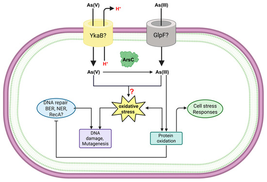The initial factor contributing to As cytotoxicity in Bacillus lies in its ability to penetrate the cell barriers, composed of both a lipid membrane and the bacterial cell wall. Thus, As can be immobilized at the cell surface by interacting biomolecules, or alternatively, transformed into a less toxic state by extracellular or periplasmic enzymes, thereby preventing its entry into the cytoplasm [25].