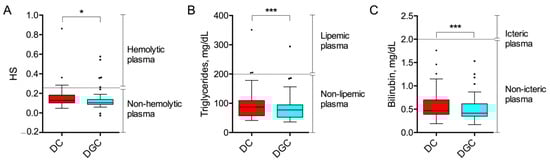 Pre-analytical factors measurement. Plasmatic hemolysis score (HS) (A), triglycerides (B) and bilirubin (C) concentration were measured in DC and DGC groups (n = 50). The dashed lines represent the thresholds for distinguishing hemolyzed (HS > 0.25), lipemic (fasting triglycerides > 200 mg/dL), and icteric (bilirubin > 2 mg/dL) samples. Data are shown as box and whisker plots. Each data point represents an individual plasma sample analyzed. Each box represents the area between the 25th and 75th percentiles [±1.5 IQR]. Lines inside the boxes represent the median values. * p < 0.05; *** p < 0.0001 by Wilcoxon test.